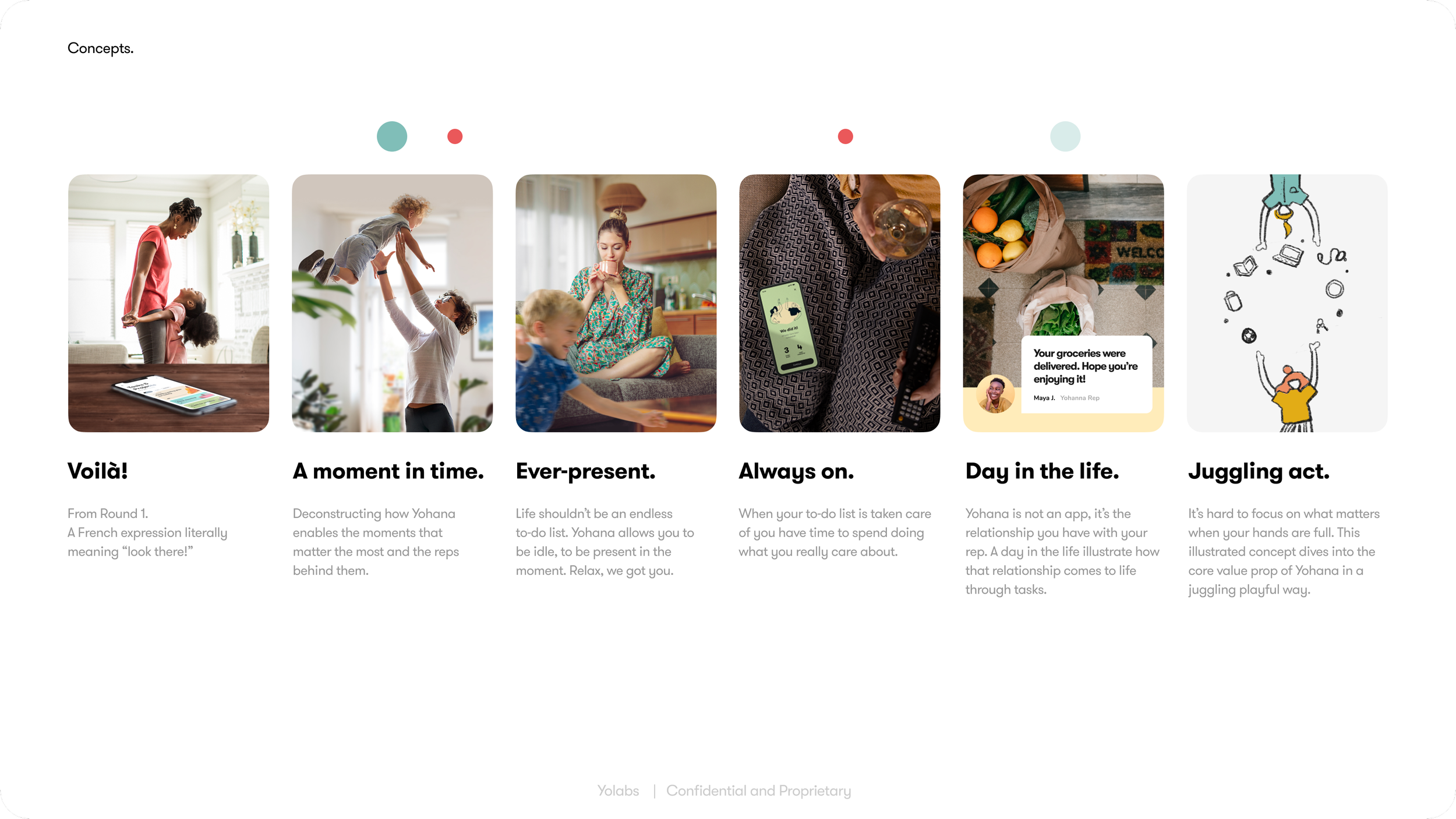 My agency team worked closely with our client to define the product, Yohana. Developing six concepts that explored various sides of Yohana’s personality, we used scales to anchor each on a set of key brand attributes to determine the best solution.